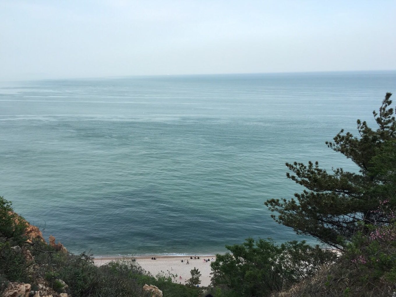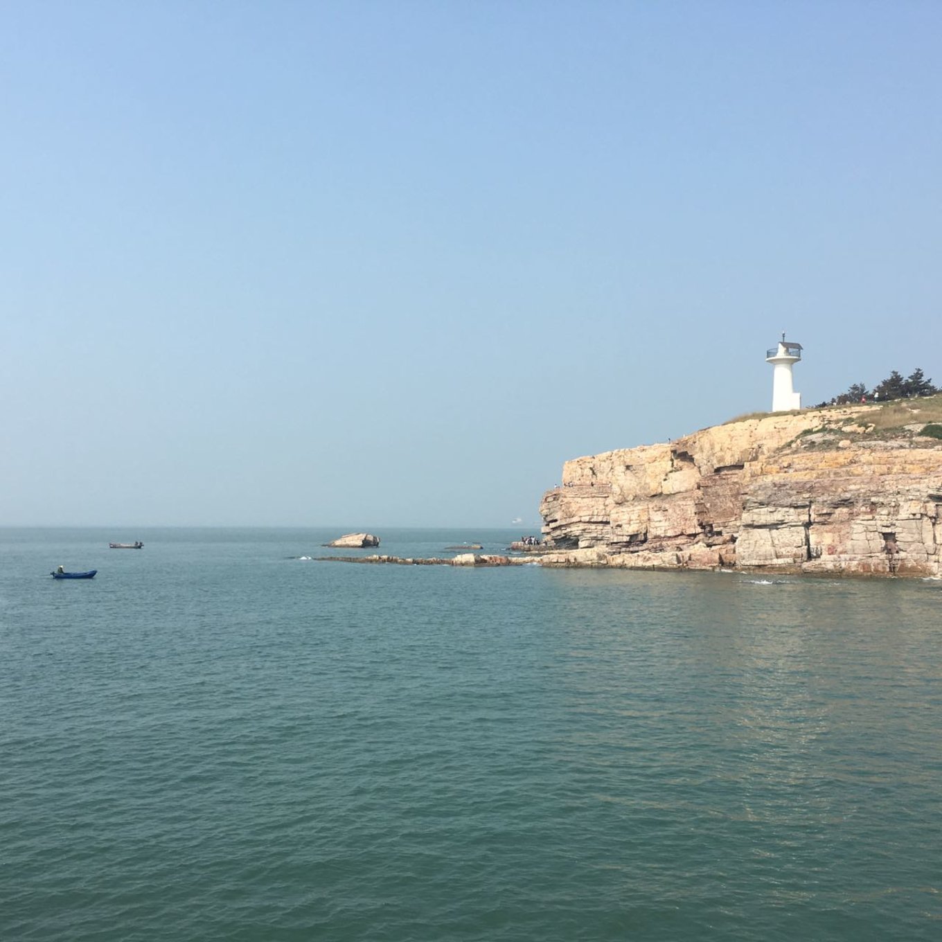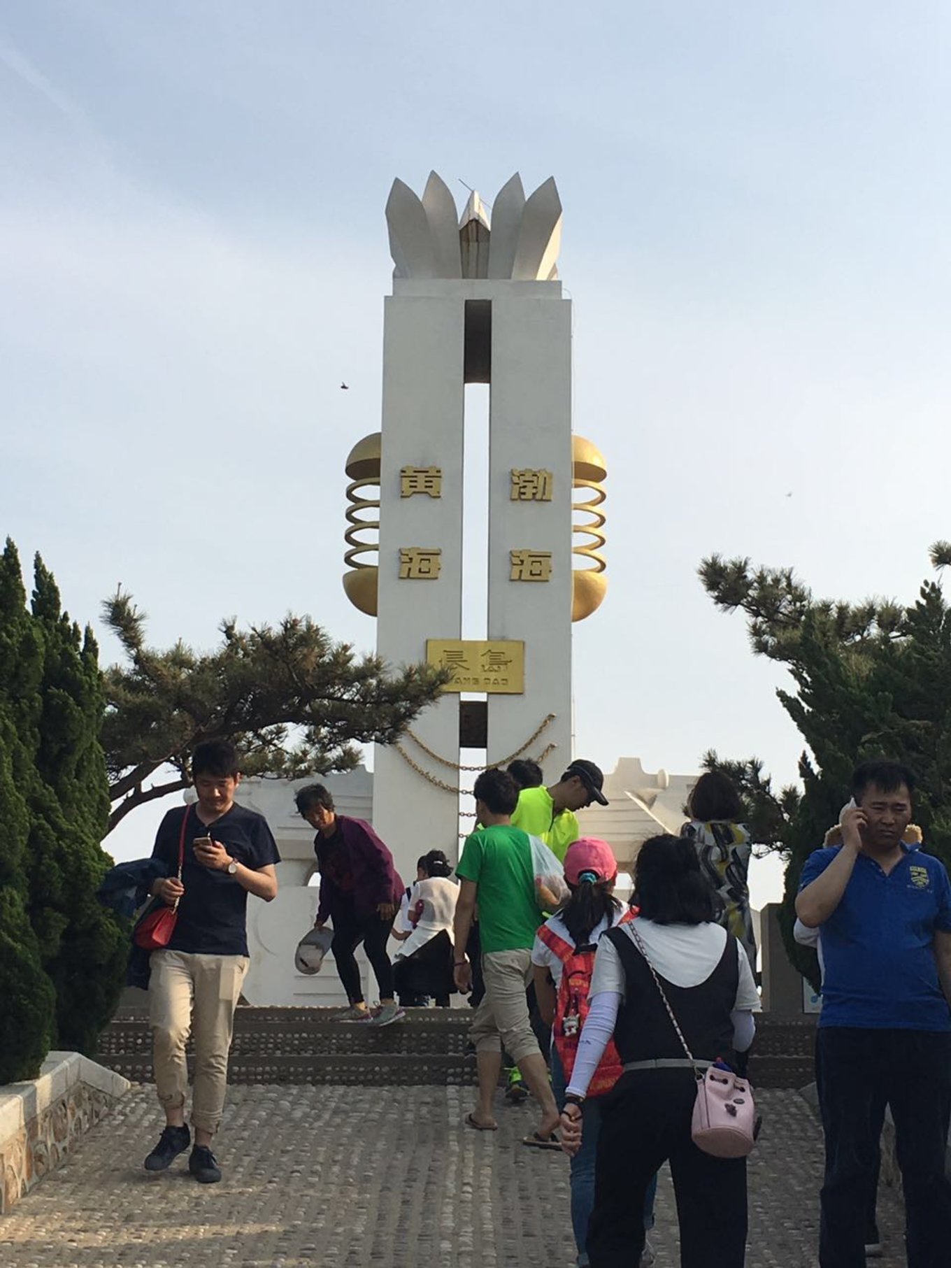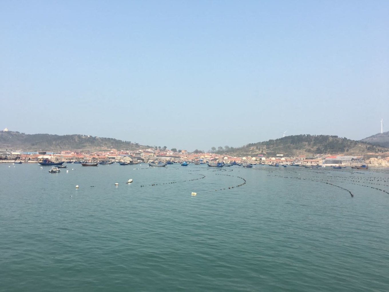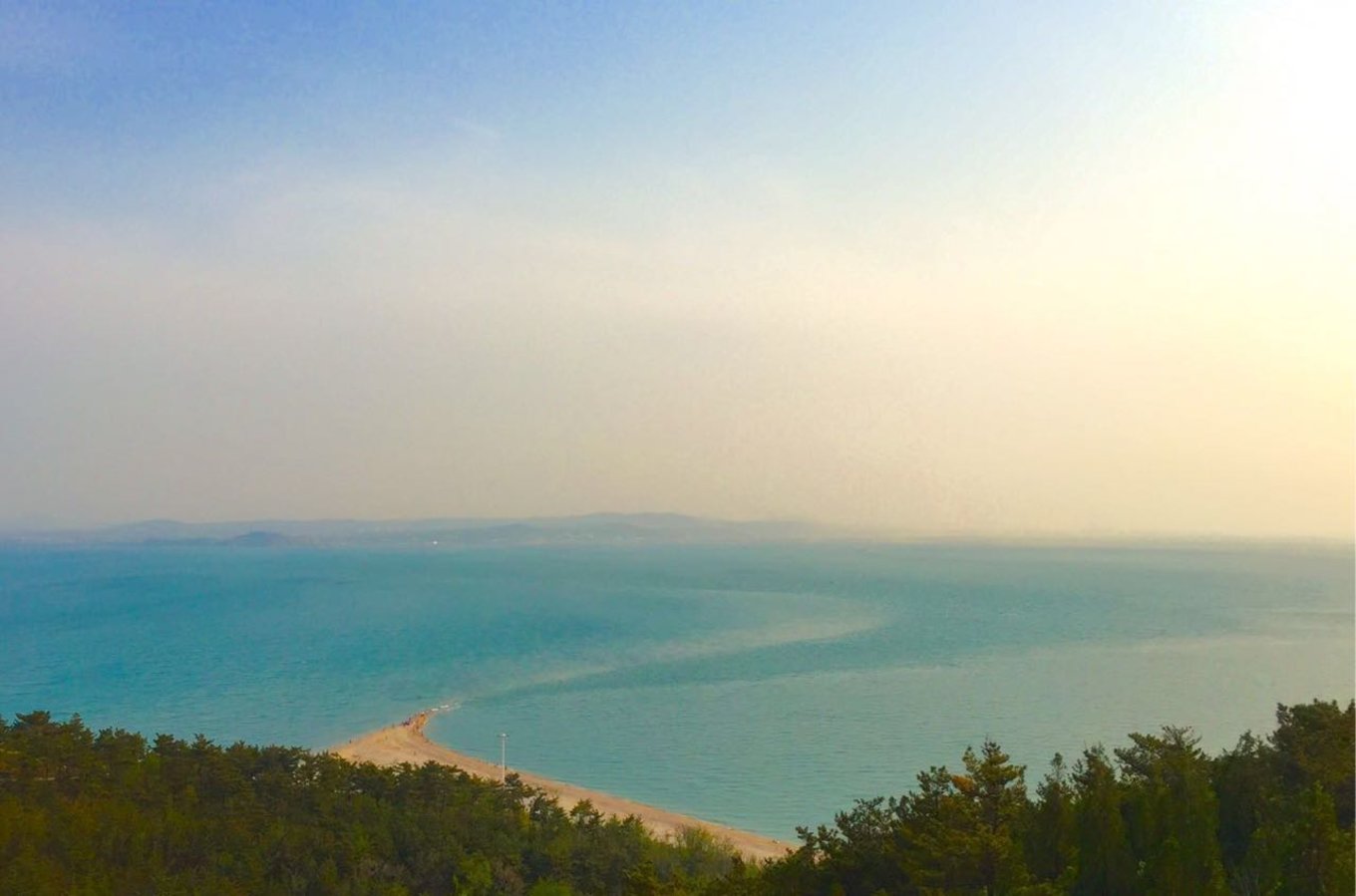 下午導(dǎo)游帶我們?nèi)チ朔樯搅趾?,就是早晨勤勞的小伙伴去看日出的地方。有山有海有人家,怎叫人不向往。?lái)這里主要是為了看黃海和渤海的分界線,黃海和渤海之間有一條S型的分界線,分界線兩側(cè)海水的顏色深淺不一樣,看上去是很不可思議的。