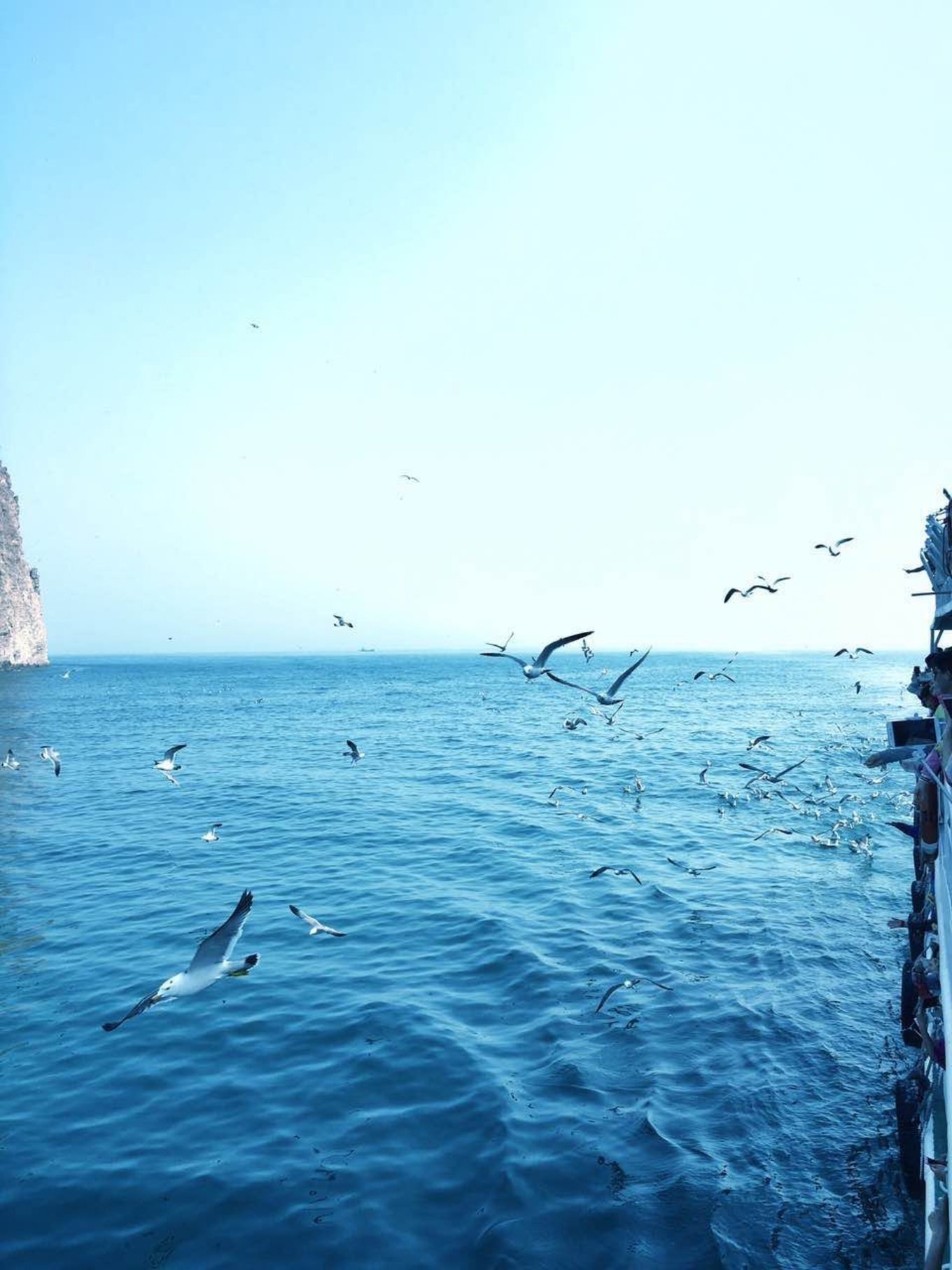 如果大海足夠讓人激動(dòng),那么萬(wàn)鳥(niǎo)島的場(chǎng)景只能用震撼來(lái)形容了,人生第一次見(jiàn)到這么多海鷗,之前聽(tīng)說(shuō)可以親自喂海鷗,內(nèi)心里一直是半信半疑的。到了萬(wàn)鳥(niǎo)島附近,就開(kāi)始有很多海鷗跟隨了,慢慢的,海鷗越來(lái)越多,大家開(kāi)始扔方便面和面包來(lái)喂它們。海鷗極其敏捷,觀察力強(qiáng)大,總能迅速叼到最大的一塊食物。大概半個(gè)小時(shí)左右,一直都有成群的海鷗跟隨著我們,后來(lái)就慢慢變少了,也許是離家太遠(yuǎn)了,它們也知道要回家。我笑著說(shuō),跟我去北漂吧,面包總會(huì)有的,愛(ài)情也會(huì)有的,嘿嘿。