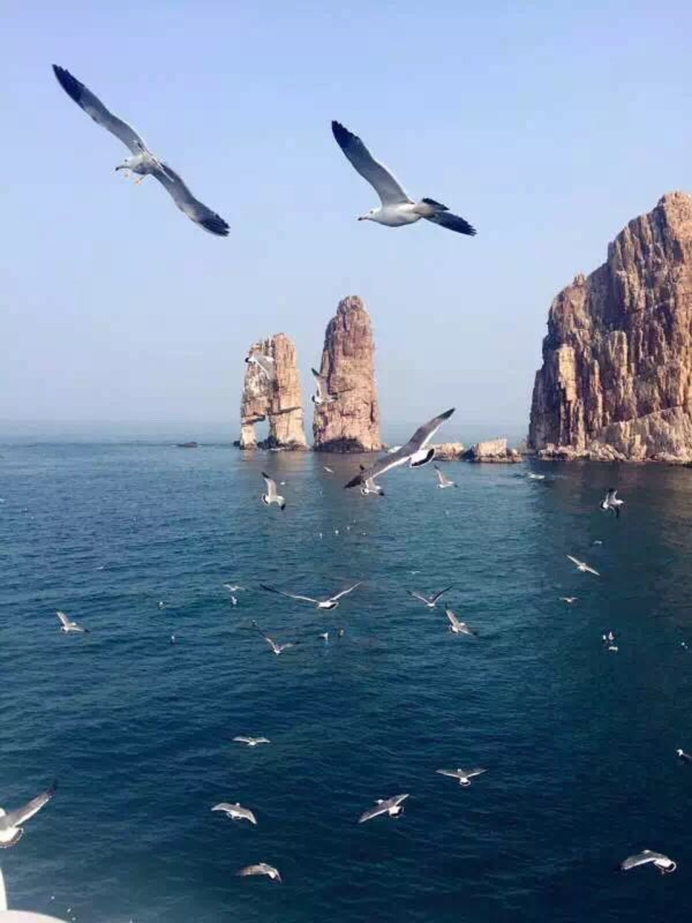 匆忙整理了一下行李,接下來(lái)是激動(dòng)人心的海上之旅,1號(hào)整個(gè)下午都是飄在大海上的。下午從長(zhǎng)島港出發(fā),目標(biāo)萬(wàn)鳥(niǎo)島??粗|闊的大海,一直想唱歌,“海岸線越讓人留戀,越是美得越蜿蜒......”,吹著海風(fēng),唱著歌,搖搖晃晃,聽(tīng)小伙伴嘰嘰喳喳,各種拍照搞怪,殺馬特風(fēng),霸道總裁風(fēng),根本停不下來(lái)。原諒這是我第一次見(jiàn)到大海,只有手舞足蹈才能表達(dá)內(nèi)心的激動(dòng)。