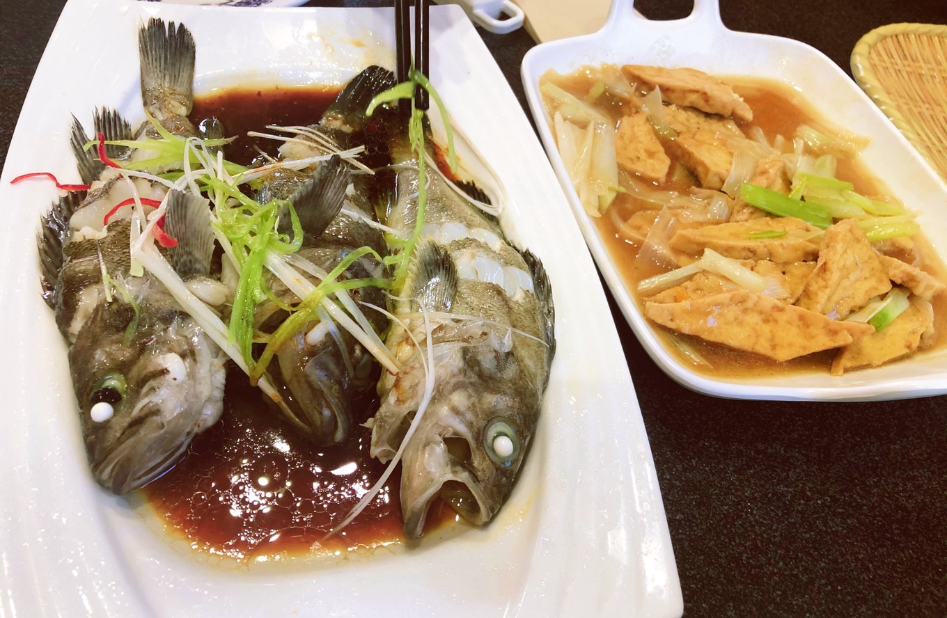 晚餐在酒店樓下餐館解決,魚(yú)98元,豆腐38元,菜碼小,味道還不錯(cuò)。