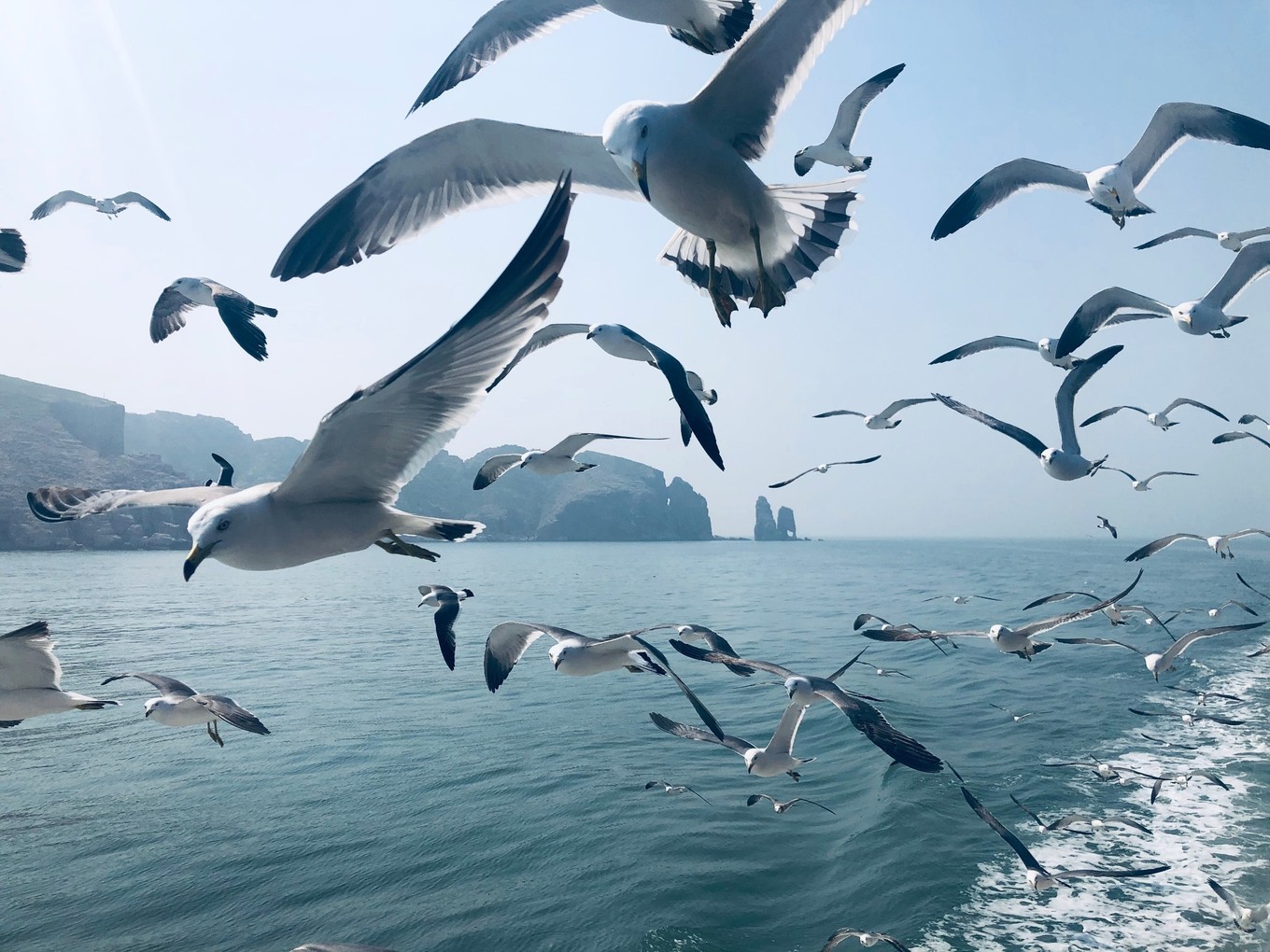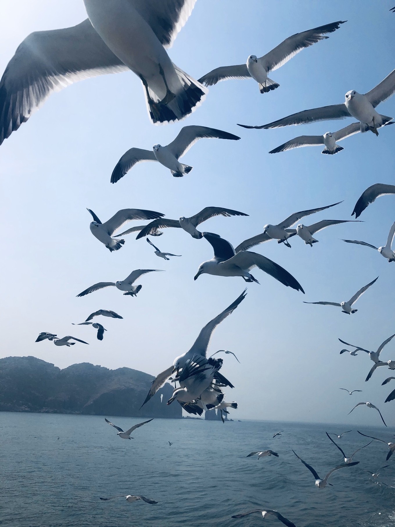 下午:去蓬萊最具代表的萬(wàn)鳥(niǎo)島。酒店幫忙訂的票價(jià)格150元,13:15到海上游碼頭換票,13:30開(kāi)航全程大約3個(gè)半小時(shí),上船后需要每人增加58元升艙,升艙非常有必要,因?yàn)榭梢詿o(wú)遮擋的近距離接觸喂食海鷗。如果帶小孩上船前一定要多買(mǎi)些火腿腸,升艙會(huì)贈(zèng)送一些魚(yú)蝦腸,有小孩的話不夠用。