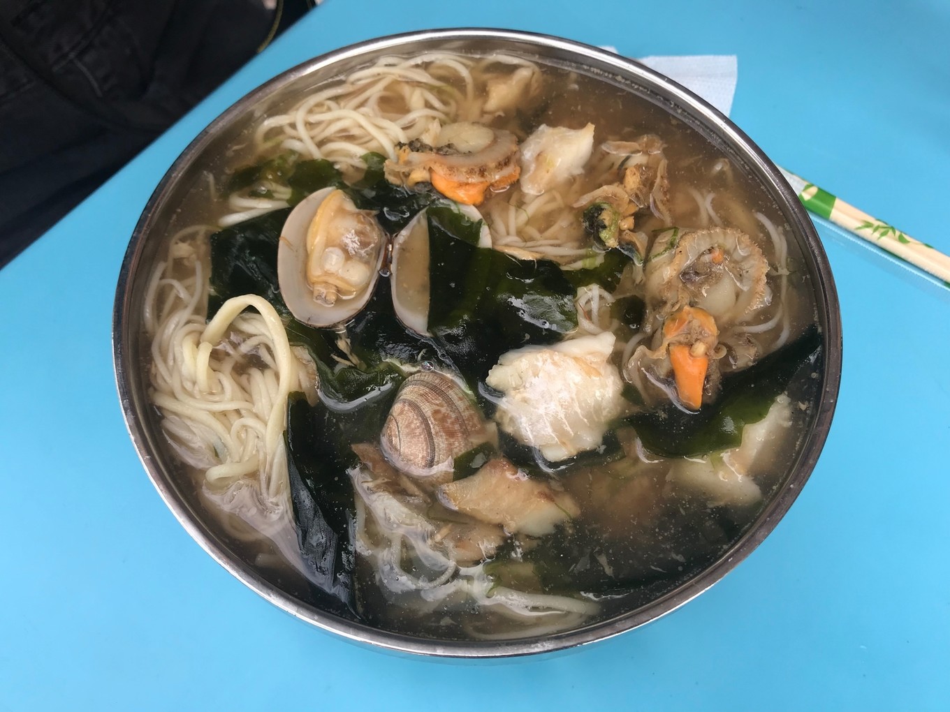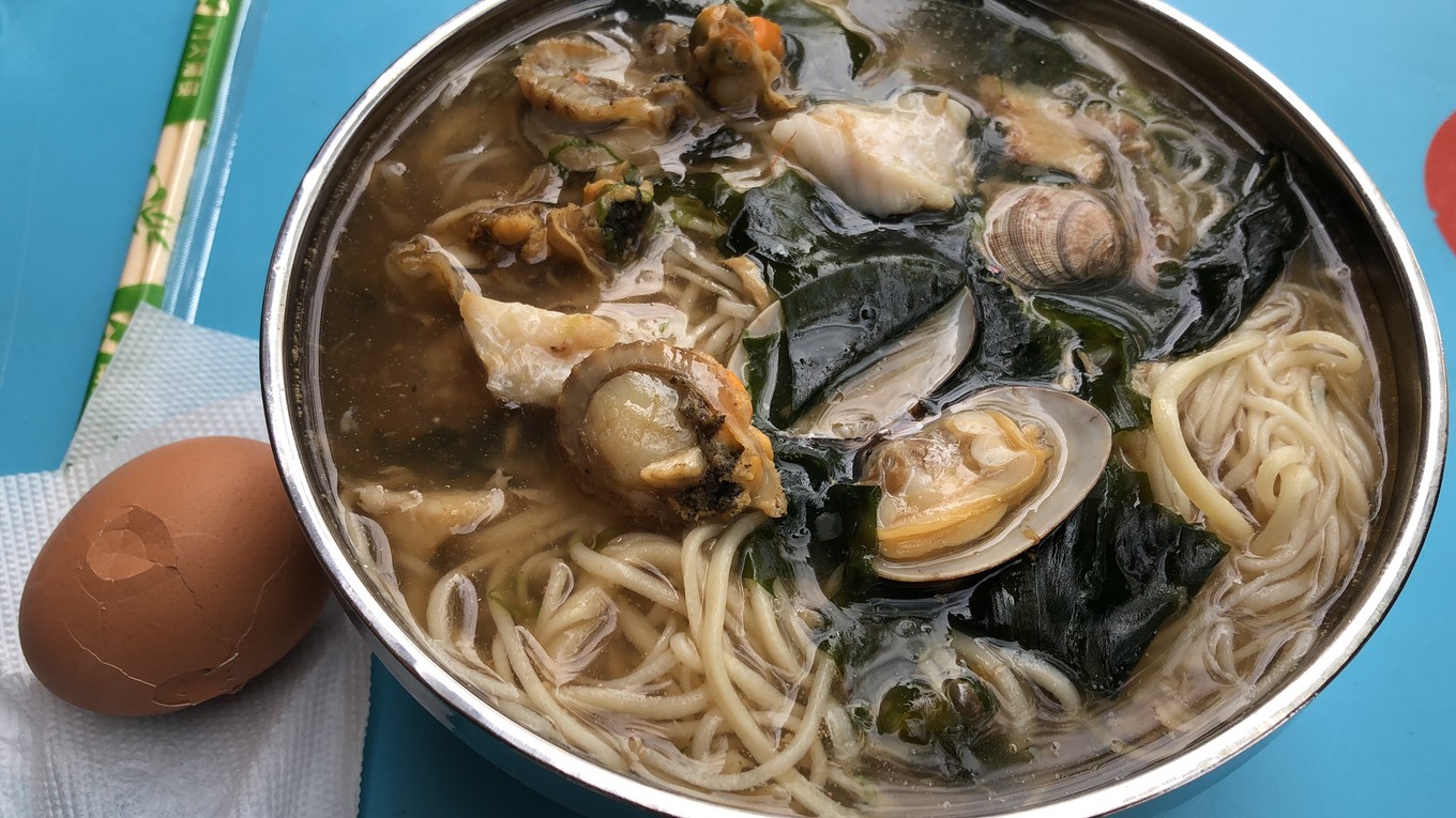 島上的蓬萊小面不多,下面介紹一家在長(zhǎng)島港對(duì)面的“蓬萊小面”館子。蓬萊小面的面,是現(xiàn)場(chǎng)加工的抻面,而澆頭有各種,最出名的有:魚肉的、骨湯的、扇貝的、海蠣子的,當(dāng)然還有全家福的海鮮小面(如下圖)。