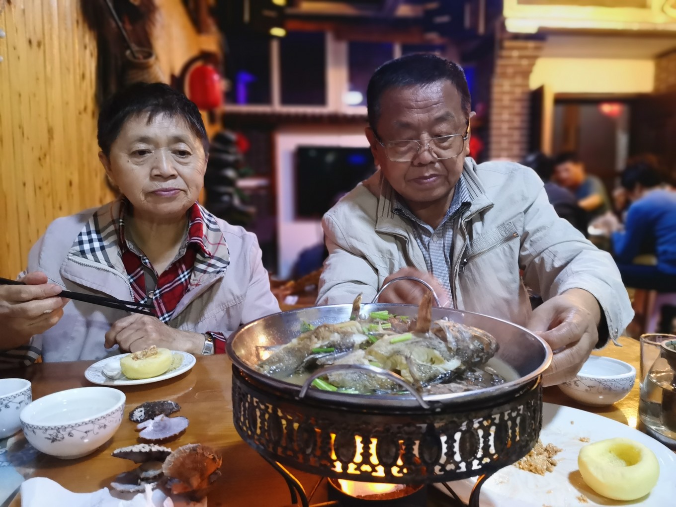結束第一天旅程,大家都很興奮,晚六點半回到客棧,晚飯已經(jīng)準備好了,蝦醬窩頭、燉魚鍋、鲅魚水餃都非常鮮美,漁家大姐還贈送了一盤蒸扇貝免費品嘗。