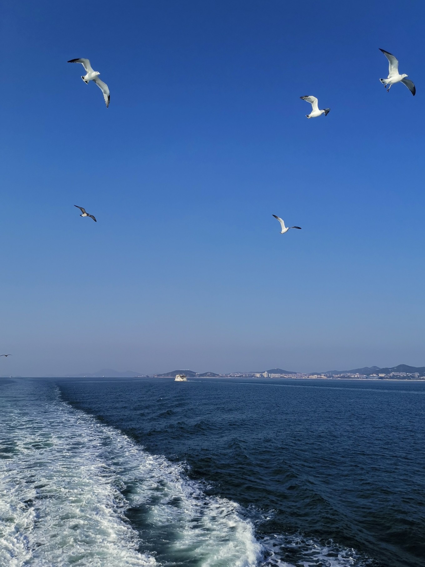 返程的船票預訂的是豪華客船觀光層,秋風稍涼,如果是夏天或許更好。小朋友也加入了船尾喂海鷗的行列,45分鐘船行漸緩,很快就在蓬萊靠岸,我們要向長島說再見了,期待下一次相遇!