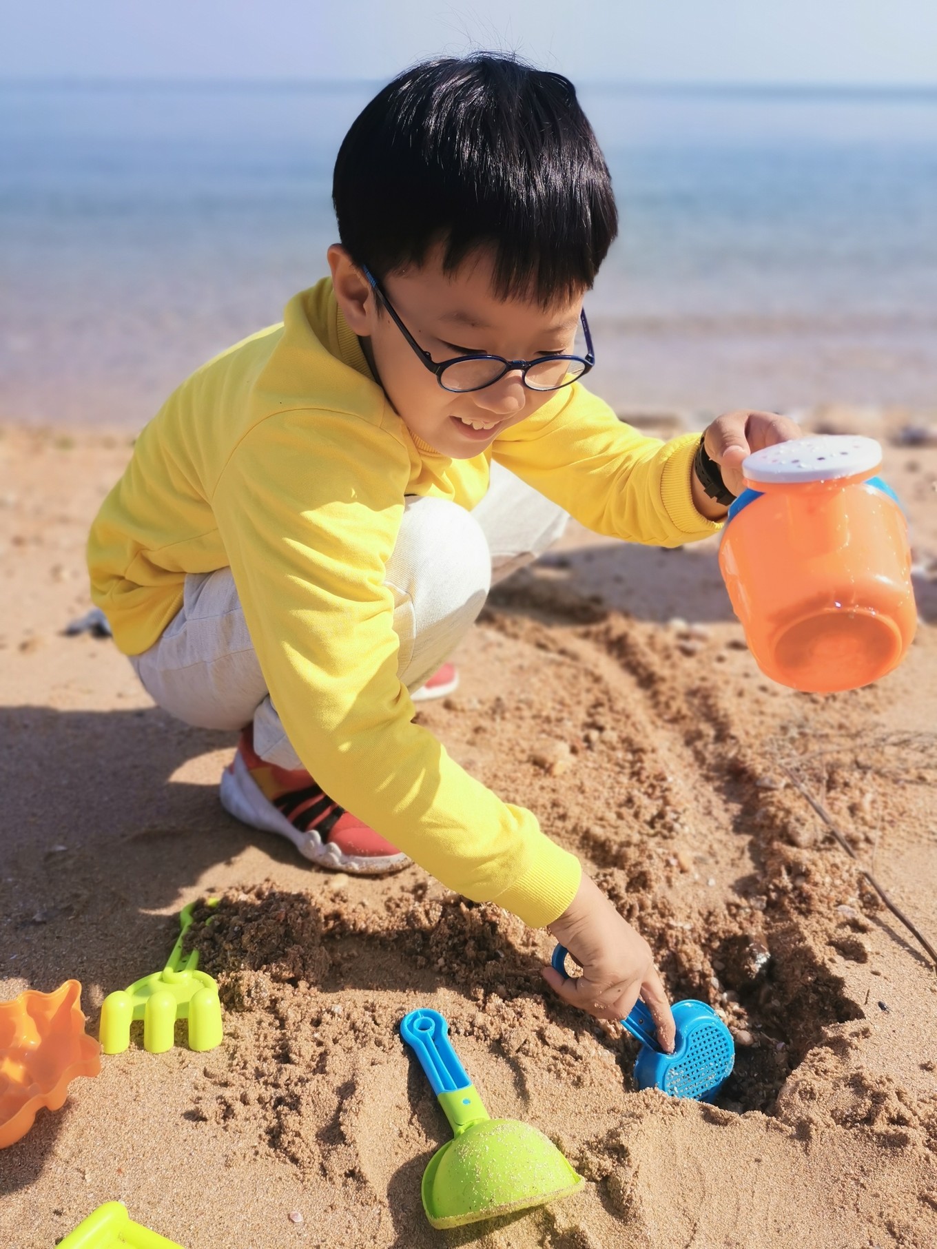沙灘一直都是孩子的游樂場,漲潮時間修好的堤壩很快就被淹沒了,為了搶險小朋友的褲子和鞋子瞬間全濕,開心就好啦!幸好提前準備了備用的鞋,秋季海邊必備!