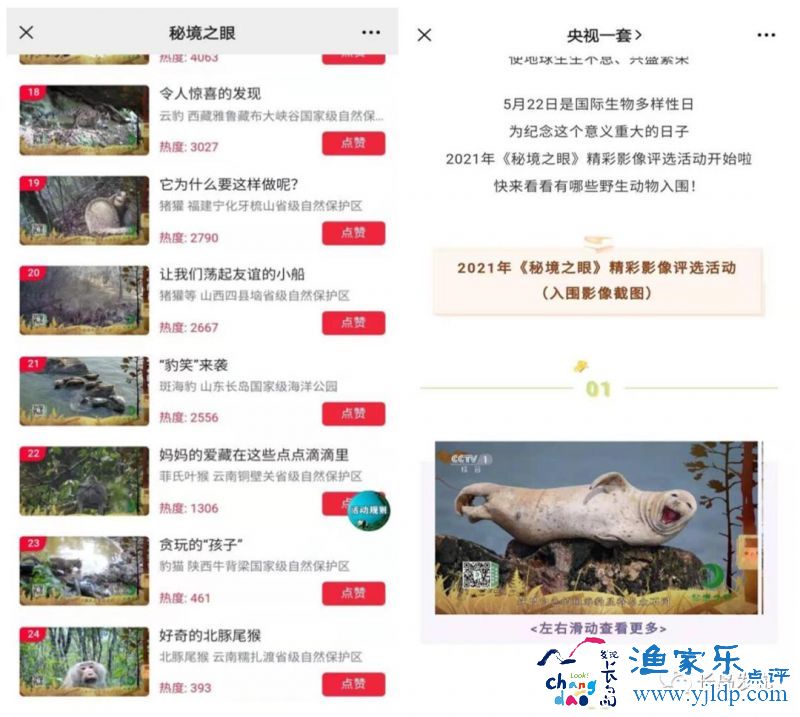 經(jīng)過初篩、復(fù)評層層選拔、精挑細(xì)選,長島“斑海豹”視頻從156期《秘境之眼》節(jié)目脫穎而出,成功入圍32強(qiáng)。央視頻APP平臺央視一套特設(shè)置評選區(qū)對最終入圍節(jié)目公開點(diǎn)贊,評選自2021年5月22日(生物多樣性日)9:00至6月10日24:00向大眾展開,最終結(jié)果6月12日(文化和自然遺產(chǎn)日)揭曉,屆時將根據(jù)最終點(diǎn)贊票數(shù)決出一等獎1名、二等獎2名、三等獎3名,優(yōu)勝獎26名。