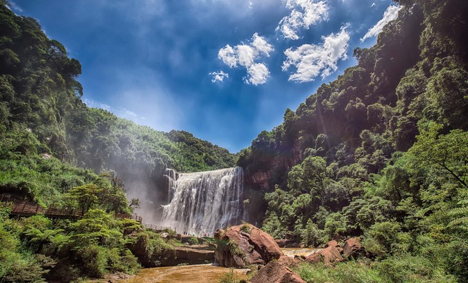 瀑布水潭邊有一塊巨石,可以爬上去近距離欣賞瀑布。但之前最好穿一件雨衣,否則猛烈的水霧會(huì)直接讓你“秒濕”。