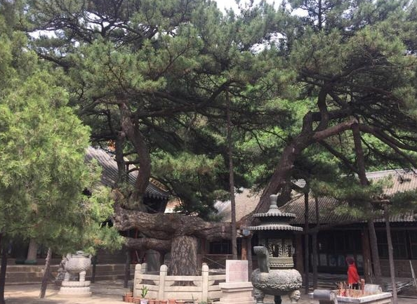另一處著名的景點則是一個千年古松——蟠龍松。蟠龍松已經(jīng)有1000多年歷史了,高12米,主干圍有3米之長,冠幅達20余米。原先的主干一共分出了八枝,后來其中三枝不幸被風折斷了。樹干枝條形態(tài)十分奇特,宛如幾條巨龍盤旋飛升,故名蟠龍松。特別是伸向大殿的一枝,在緊鄰屋檐的地方自顧地升了起來。于是,僧人們便認為這顆松樹受到了佛祖的感悟具有靈性。
