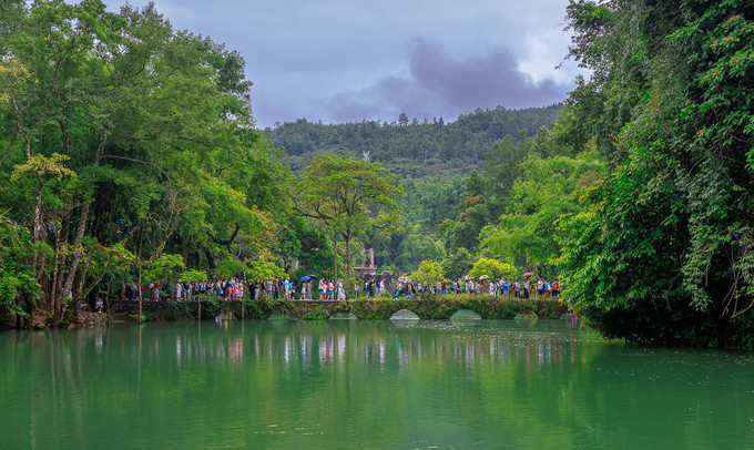 一進景區(qū)廈大門,便能看到這傳說中的小七孔了??梢钥吹?,因水位上漲已經(jīng)快要把七個橋洞給完全淹沒,七孔只剩下了一點點頂部的空間,與想象中的樣子差距有點大,橋上人很多,但相比昨天的水簾洞還是好得多。