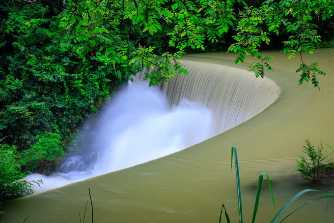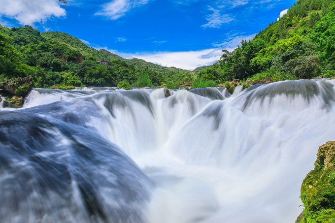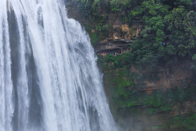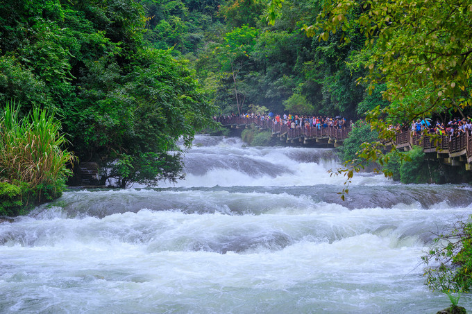 在小七孔景區(qū),幾乎就是一直沿著河流、瀑布邊上行走,最先經(jīng)過的是68級跌水瀑布,其實就是因勢而自然形成的河谷斜坡,河水沿著這一級級的階梯奔涌而下。具體是不是68級那就不得而知了,恐怕沒人數(shù)過,也數(shù)不清,畢竟很多階梯都沒有明顯界限。去的時候正值汛期,連日下雨,河水流量很大,水聲震耳,場面還是比較壯觀的,照片看起來要差很多。