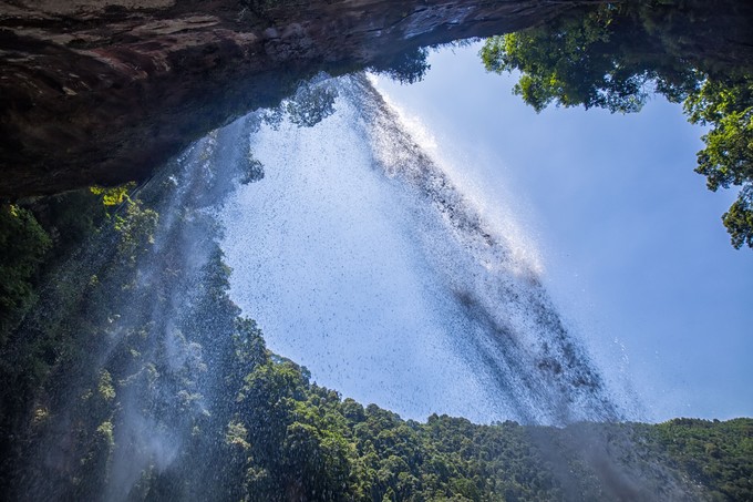 在這里你可以換一個視角由內而外地去觀察瀑布,從高處墜落的水流在在空中散成一捧晶瑩剔透的珍珠,閃著光亮。透過水簾可以看見險峻的山石、郁郁蔥蔥的樹木,還有藍得透亮的天空。