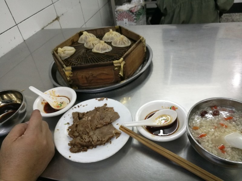 灌湯包子有了形式美,其內(nèi)容精美別致,肉餡與鮮湯同居一室,吃之,便就將吃面、吃肉、吃湯三位一體化,是一種整合的魅力。吃灌湯包子,湯的存在列第一位,肉餡次之,面皮次次之。