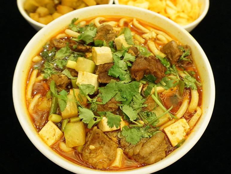 羊肉搓面是寧夏地區(qū)盛行的一道美味面食,口感勁道,面精肉鮮,讓人欲罷不能。羊肉搓面是將面搓成筷子般粗,下鍋煮熟,再澆上用羊肉原汁、羊肉丁和新鮮蔬菜燴成的湯,最后放入辣椒紅油調(diào)味,鮮香無比,回味無窮。