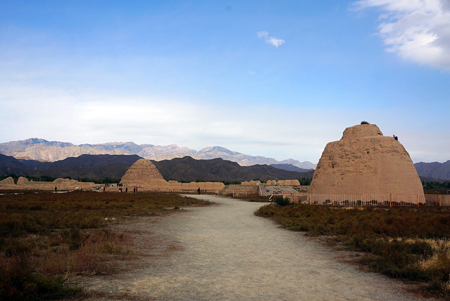 遠(yuǎn)處雄偉的賀蘭山脈,一望無垠的黃色王陵建筑,廣袤的藍(lán)天白云,置身于此,體會(huì)古老神秘的西夏王國。