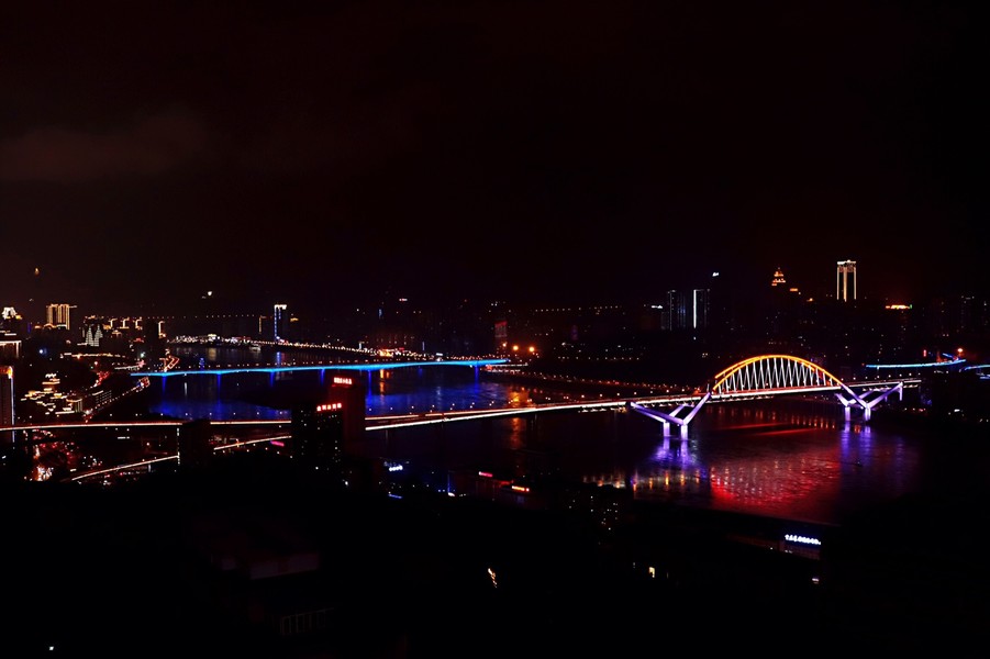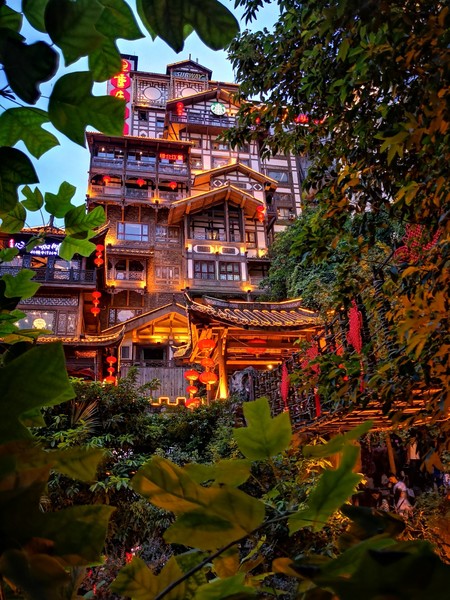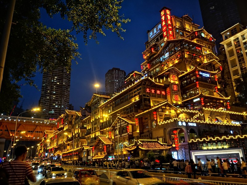 從一層馬路對面進行拍照,可以看到整個建筑物都被燈光點亮,一派富麗堂皇的景象,游人如織、車流緩慢,重慶的夜生活開始了!