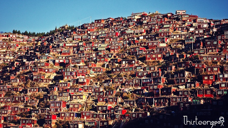 色達喇榮寺五明佛學院,也稱色達佛學院,常住的喇嘛有近萬人,堪稱“世界第一”規(guī)模佛學院。每遇有佛事活動,人數(shù)還會增加,最多時可達4萬多人。這里的僧舍很壯觀,如果是初次到色達,其龐大的陣勢往往會讓來者目瞪口呆。連綿數(shù)公里的山谷布滿了密密麻麻的小木棚屋,這便是成千上萬的喇嘛和尼姑們的宿舍,谷底和山梁上分布著幾座寺廟和佛堂,身披絳紅色僧袍的喇嘛和尼姑來來往往,充滿濃郁的佛教氣氛。
