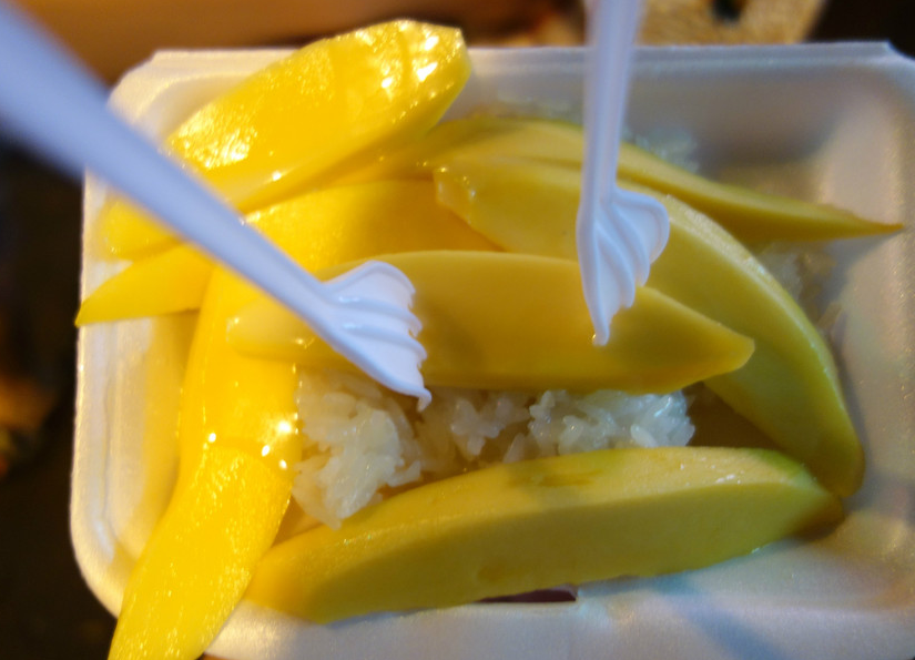 這是泰國經(jīng)典的甜主食,芒果和糯米飯要一起進嘴才能起最魔幻的化學反應。芒果甜中帶酸,可這酸味馬上與裹上了泡浸香濃椰漿的泰國香糯米飯的甜味混合了去,美妙得緊,糯米潔白如玉,芒果燦燦如金,大魚大肉油膩過后,這道主食最為清新爽口。