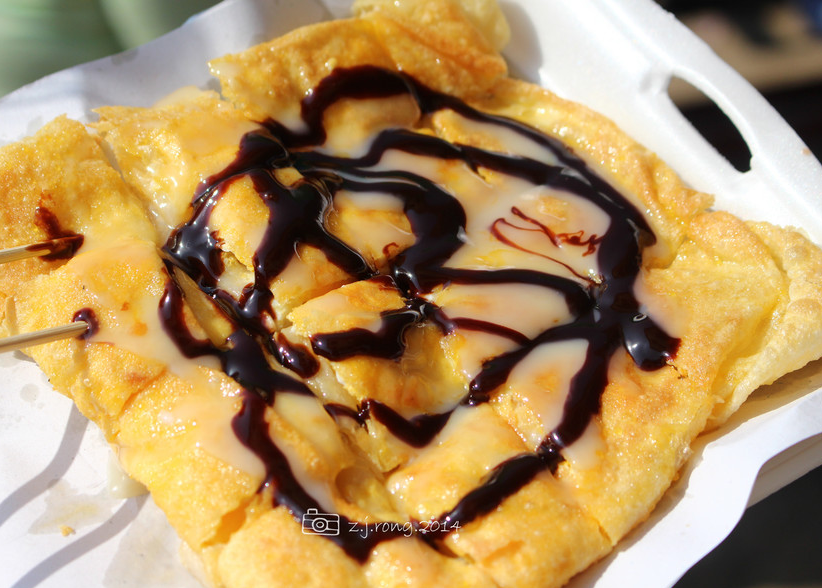 這是一款街頭巷尾都可以看到的小吃,有點類似中國的煎餅果子,但是味道確實甜的。攤薄的面糊中加入切好的香蕉片,再將面糊折疊成方塊狀后淋上巧克力醬、煉乳等。吃起來香甜可口,讓人欲罷不能。