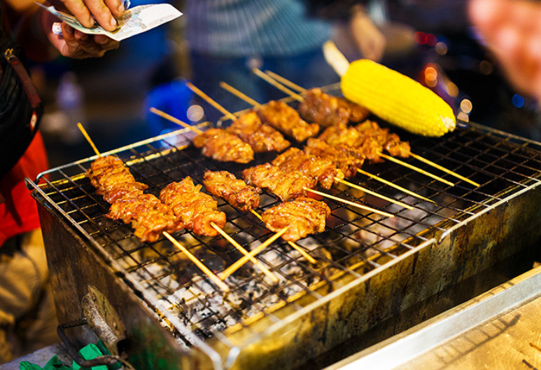 用秘制醬料腌漬過的肉串經(jīng)過炭火烤制,香濃肉汁慢慢滲出,同時也散發(fā)出誘人的香氣。烤肉的品種多樣,有肋排、雞肉、豬肉、肉丸、動物內(nèi)臟等等,可以蘸上特制泰式辣椒醬,口味非常獨特。泰國人享用烤肉時一般搭配著糯米飯,作為一餐正餐。