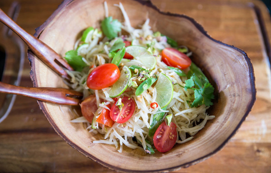 清爽酸辣的青木瓜沙拉是泰國東北的菜肴,將青木瓜削成絲,拌上魚露、檸檬汁、紅蔥、大蒜、辣椒、小蕃茄、蝦米等材料,正統(tǒng)東北口味還會加上腌過的小生蟹,和所有的材料一起放進木臼里搗碎攪拌后盛盤。
