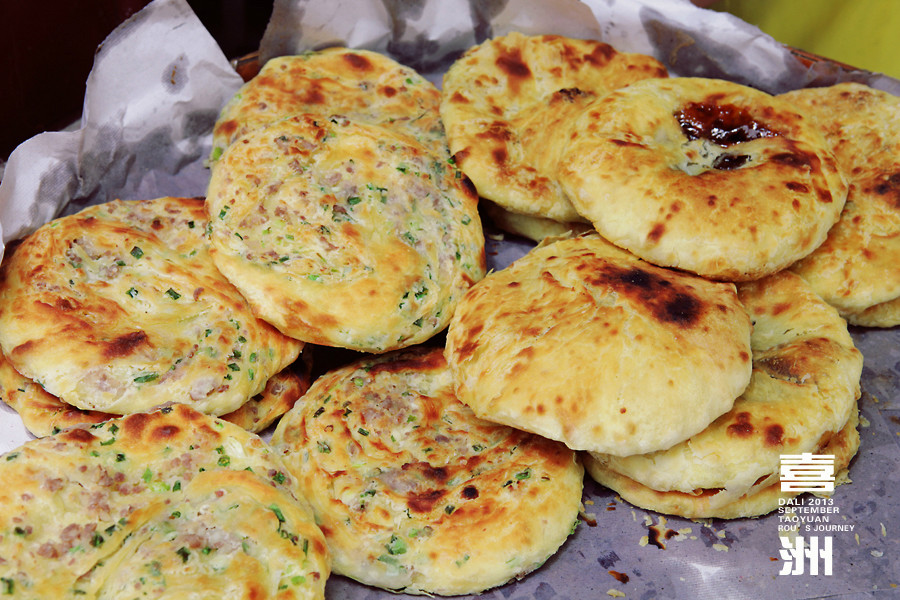 喜洲破酥粑粑,口味有甜、咸兩種。粑粑原料為麥面,制時(shí)用上下兩層炭火,將鍋內(nèi)油炕著的粑粑慢慢烤黃、烤香直至烤酥。粑粑外皮香酥內(nèi)在綿軟,且層次分明。喜洲鎮(zhèn)內(nèi)有很多賣粑粑的小店,其中以德生和比較出名。另外,大理古城內(nèi)也有一些小攤和食鋪可以買到。