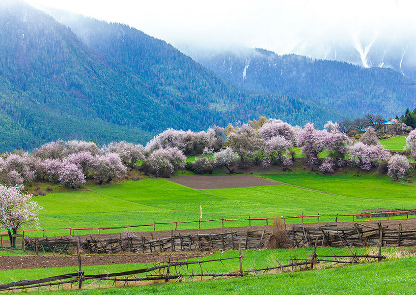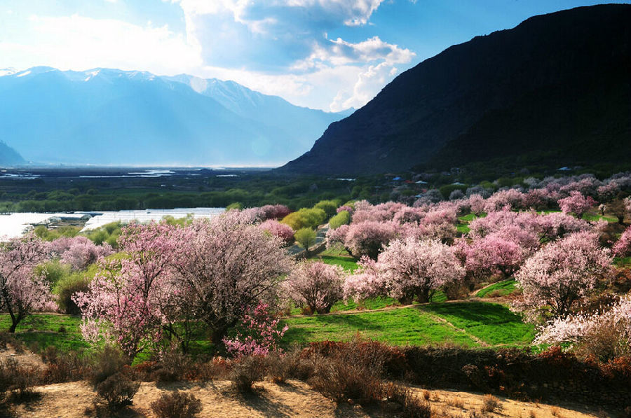3、4月的林芝是花的海洋,遠方的雪峰還有皚皚白雪,桃花已如醉霞緋云般地爭相斗艷。粉嫩的桃花,雪白的梨花在氣勢磅薄的雪山懷抱中無限柔媚。