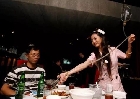 臺灣有家主題餐廳,經營風格另類,服務生穿上護士服,餐桌上還有提供飲料的“點滴”。進入餐廳后,客人甚至可以要求坐在輪椅上,請服務生幫忙推進去。餐廳內墻壁上掛X光片、視力測量表,飲料則在點滴瓶內。另有試管飲料,由服務生推著“護理推車”,用針筒把“試管酒”飲料“注射”到消費者嘴巴里。