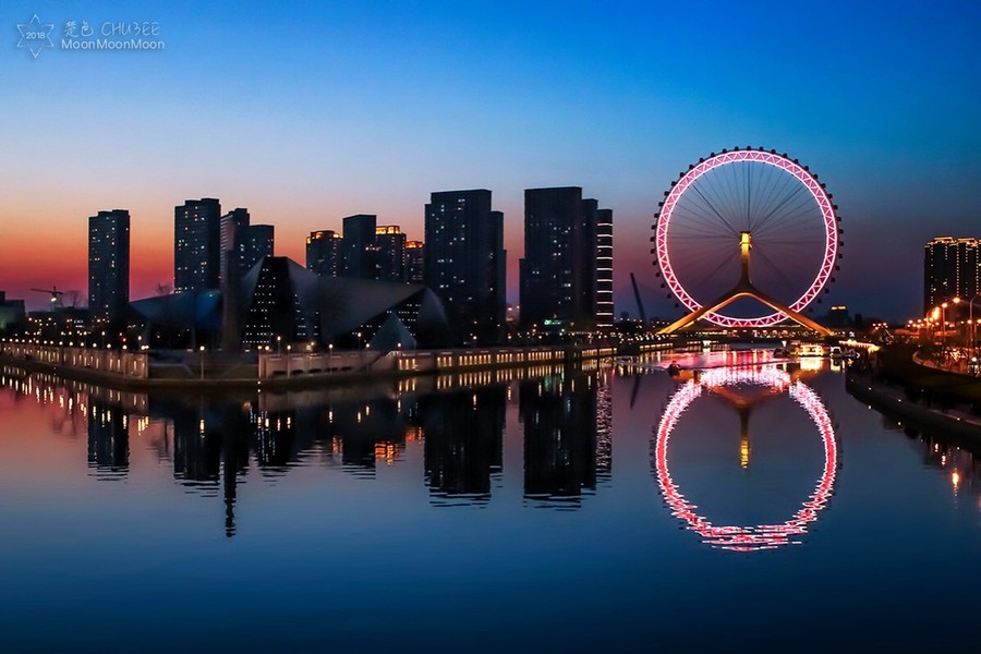 夜幕降臨后,就去海河之上的天津之眼,這里也是新天津的地標(biāo)之一。乘坐摩天輪觀賞、拍攝天津的美麗夜景。