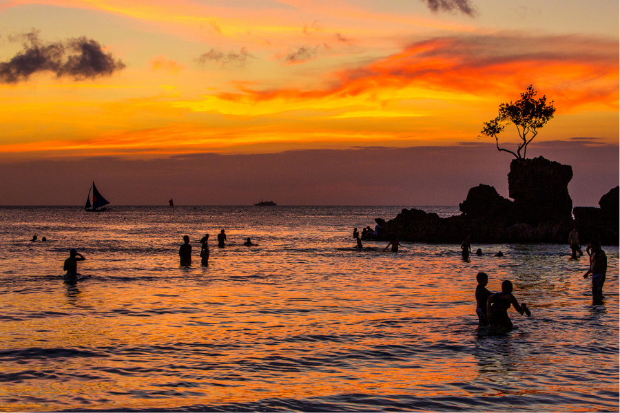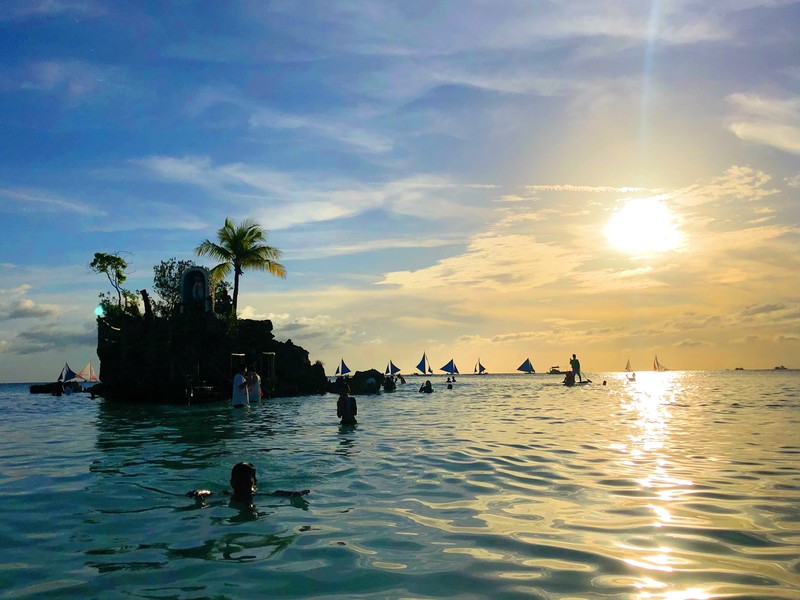 漲潮時(shí),圣母像孤立在海中央,一定得游泳才有辦法靠近哦。潮落后,有沙灘露出水面,游人可從沙灘輕松散步走到礁石,在這里眺望整片白沙灘。其實(shí)不只觀光客在這里拍下到此一游的照片,仔細(xì)觀察,好多菲律賓人會(huì)坐在附近沙灘野餐,也有大人帶孩子特地來(lái)散步。