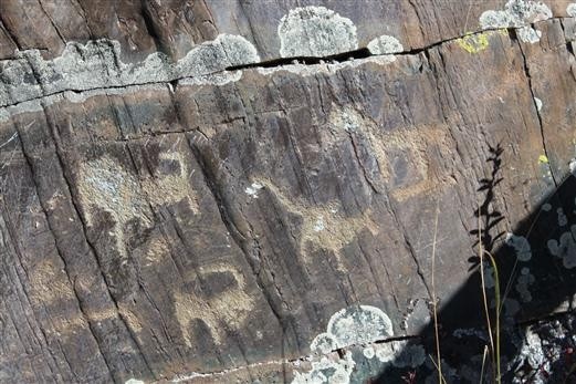 吐魯克巖畫位于喀納斯湖一道灣東岸的變質(zhì)千枚巖上,基巖經(jīng)古冰川作用形成一種特殊的地貌景觀——羊背石,巖畫即附雕其上。巖畫共分為兩處。第一處巖畫在羊背石背面磨光的刻石槽內(nèi),大部分模糊不清,只有少許圖案可見刺猬、野豬、山羊、雪雞等動物造型;第二處巖畫在羊背石背面的小陡坎上,圖案多清晰可見,內(nèi)容是以馬、羊、狼、狗、鹿、雪雞等動物為主。最大的一幅為梅花鹿圖案,鹿角向上,眼睛俯視前方,栩栩如生,一幅悠閑自得的模樣。儼然是游牧民族生活的真實(shí)寫照。