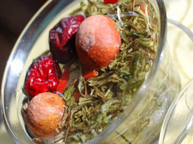 三泡臺因其茶具由茶蓋、茶碗、茶托三部分組成,故名三泡臺,也叫“刮碗子”,喝之前一定要提起蓋在碗口刮幾下,把料攪起來,所謂“一刮甜,二刮香,三刮茶鹵變清湯”。三泡臺的配料有:春尖茶、紅棗、桂圓、枸杞、玫瑰、杏干、葡萄干、冰糖等,當(dāng)?shù)厝巳粘6紩?,只要是休閑的地方,都會看到躺椅、三泡臺的身影。