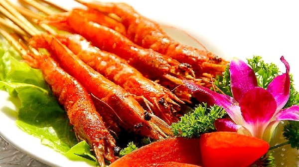 主料是去腸留殼的全對(duì)蝦,加各種調(diào)料后放到鍋里用文火慢烤直到收干湯汁。成品的大蝦頭尾相連,很像一朵盛開的牡丹花,色香味俱全,讓人食指大開。