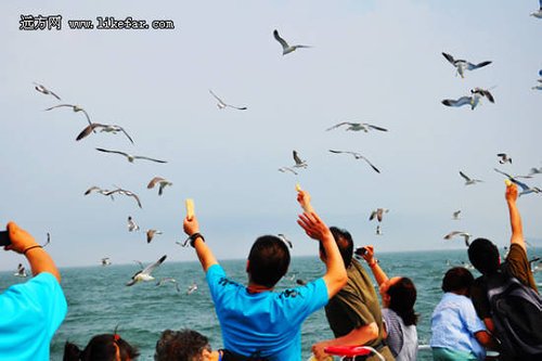 三、游萬鳥島觀鳥:到了長島不去看萬鳥齊飛的景象怎么行!萬鳥島絕對是體驗近距離接觸海鳥的最佳場所,從碼頭乘著客船出海即可前往。小編去的那天,游船一行駛出攔海大壩風浪就劇烈起來,我一邊緊緊抓著船欄桿,一邊不忘高舉鳥食,一有鳥下落過來就趕緊騰出手拍照片,既刺激無比又驚險萬分。山東長島漁家樂
