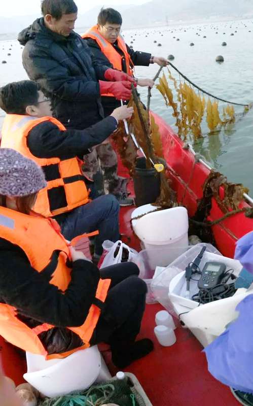 12月17日,山東省現(xiàn)代農(nóng)業(yè)產(chǎn)業(yè)技術(shù)體系藻類產(chǎn)業(yè)創(chuàng)新團(tuán)隊(duì)崗位專家孫利芹教授一行三人同山東長島縣水產(chǎn)研究所一行三人到大欽島鄉(xiāng)東村觀察近期引進(jìn)的海帶新品種生長情況。長島漁家樂通過測量比較,發(fā)現(xiàn)于上月完成夾苗的海益新品種現(xiàn)平均長到1.5m,黃官新品種由于夾苗晚于海益,現(xiàn)平均長到0.8m,總體長勢(shì)不錯(cuò)。