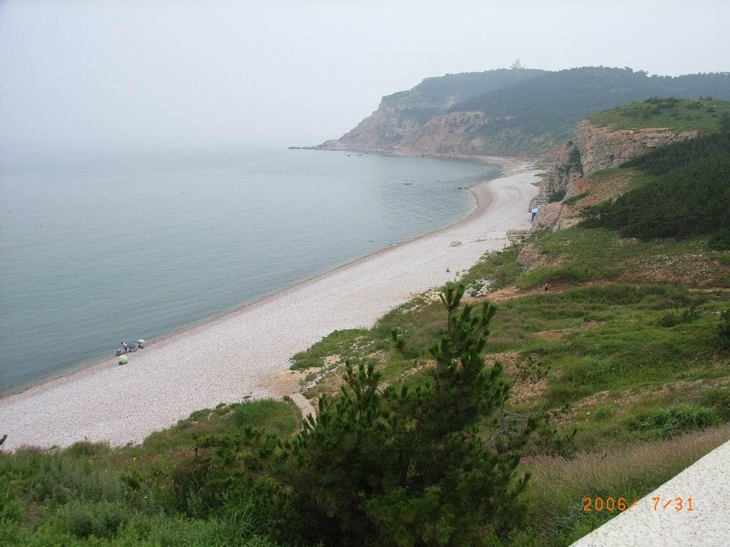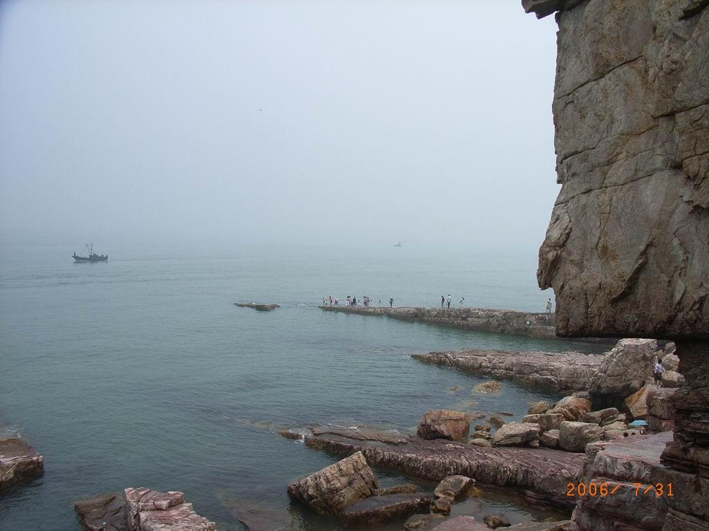 出來就去了九丈崖,長(zhǎng)島名氣最響的景點(diǎn)之一。其實(shí)個(gè)人感覺九丈崖的風(fēng)景也一般,網(wǎng)上也有大量圖片和介紹。因?yàn)榇蠖鄶?shù)旅游團(tuán)都會(huì)把這里當(dāng)作必游的景點(diǎn)之一,所以我們雖然是禮拜一去的,但是九丈崖的人還是蠻多的。原說到上不讓外國(guó)人上的(網(wǎng)上看到的,說以前島上是海軍基地,怕有間諜),但也看見一個(gè)金發(fā)碧眼的老外,不過倒沒見著拿照相機(jī)拍什么。從半山上俯視鷗翅灣(GF開始居然說是雞翅灣,后來一整天都沒和我頂嘴,平常P話很多地說,哈哈),景色不錯(cuò),也放張照片吧。