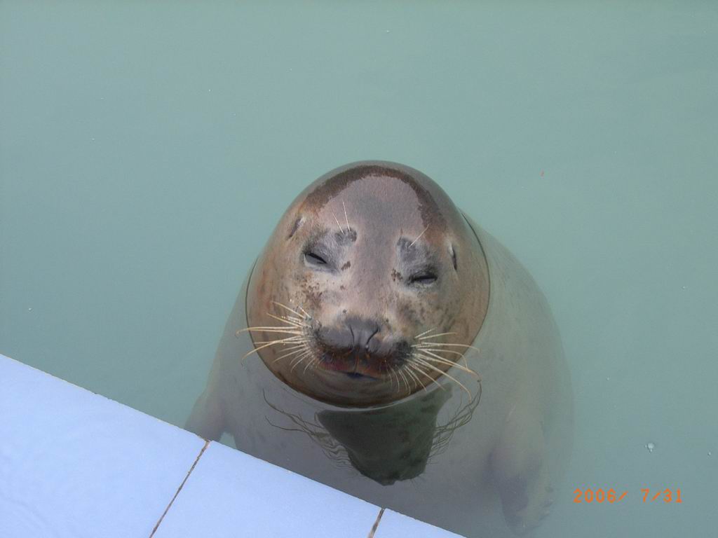 月牙彎外面還有海豹館,沒頂?shù)哪欠N。海豹一定要喂哦,5塊錢,能和海豹近距離接觸呢。海豹看上去個(gè)個(gè)都很慵懶的樣子,但要是你把魚伸出去,吃的動(dòng)作快的一點(diǎn)也不含糊。有一個(gè)特別可愛,給他來個(gè)特寫吧。之后還有免費(fèi)的海豹表演,這種節(jié)目大多千篇一律,因?yàn)橛袝r(shí)間,我們也就隨便看了看。