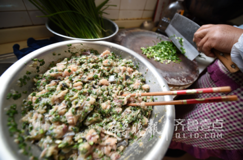 黑石嘴一家漁家樂正在為客人準(zhǔn)備山東長島特色的鲅魚塊餃子