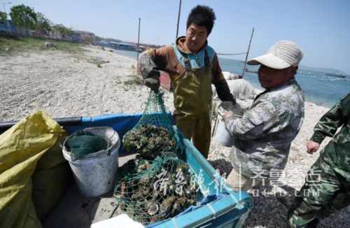 在黑石嘴村海邊,老漁民黃元臣正忙著將剛撈上來的新鮮海螺搬上摩托車, 他兒子正在清理小漁船上雜物。黃元臣說,出海打漁是累活,休漁期應(yīng)該能休息 了,但是他們一點(diǎn)也閑不著,因?yàn)闈O家樂的旺季即將到來,他們要忙著準(zhǔn)備漁家樂,口碑最好的長島漁家樂 準(zhǔn)備招待客人。