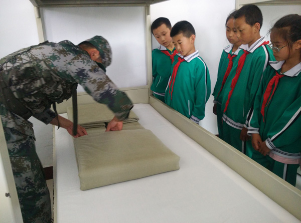 在軍營(yíng)中,學(xué)生們參觀了部隊(duì)訓(xùn)練基地、活動(dòng)中心、戰(zhàn)士宿舍,聽(tīng)?wèi)?zhàn)士們介紹了部隊(duì)的光榮歷史和優(yōu)良傳統(tǒng),還現(xiàn)場(chǎng)觀摩戰(zhàn)士整理內(nèi)務(wù)??粗鴳?zhàn)士們疊得整齊如豆腐塊似的被子,學(xué)生們不由自主發(fā)出“嘖嘖”的贊嘆聲。
