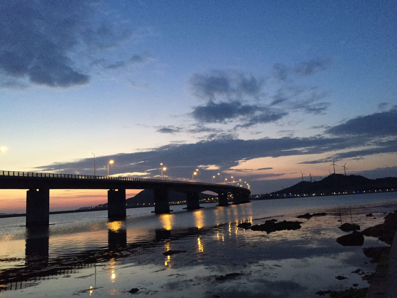 回酒店途中,司機(jī)載著我們?nèi)ヅ南逻@張,夜幕下華燈初上的聯(lián)島大橋。