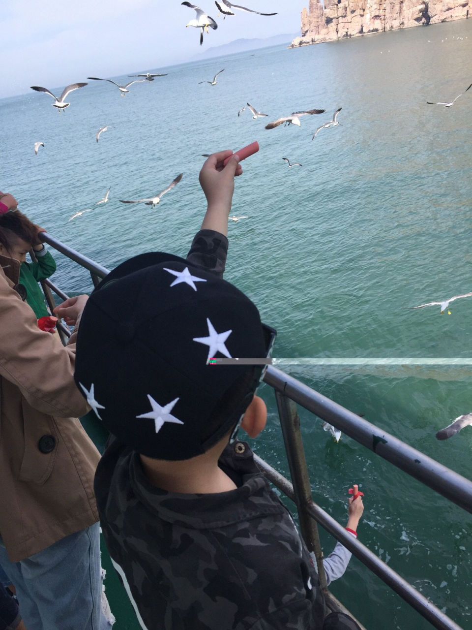上到船的頂層大人另付10元,小孩免費(fèi),說(shuō)是可以喂海鷗。如果你的行程里有萬(wàn)鳥(niǎo)島,這里不大需要,因?yàn)楹zt少,并且還是船員哨子吹著引過(guò)來(lái)的。