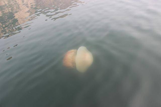 突然一聲驚呼“水母!”可不是嗎,一只呈白色半透明的水母在水里游啊游。顧先生抄起漁網(wǎng)撈了上來(lái),說(shuō):不錯(cuò),今天給你們做水母湯喝!又突然,“又一個(gè)又一個(gè)!”“這個(gè)是海蜇?!边呎f(shuō)著顧先生一網(wǎng)又撈了上來(lái),嗯,這個(gè)小了許多,透明的褐色,哦?這就是我們?cè)诔欣镔I的海蜇嗎?大家的好奇心都來(lái)了?!巴弁弁?!又來(lái)啦,水母!水母!”往水里看去,這個(gè)超大啊,水母的身體像一個(gè)大傘帽,一張一翕的,很多觸手在水中有秩序地游著,山東長(zhǎng)島第一次這么近距離地看到它,禁不住感嘆起大自然的奇妙來(lái)。這感嘆還沒(méi)結(jié)束呢,這只可憐的水母又被顧先生撈了上來(lái),這只大啊,撈了好久,網(wǎng)桿都彎了,終于撈上來(lái),顧先生開心地說(shuō):“今天可以給你們吃一頓新鮮的水母湯啦!”大家也表示興奮,出海仍在繼續(xù)。