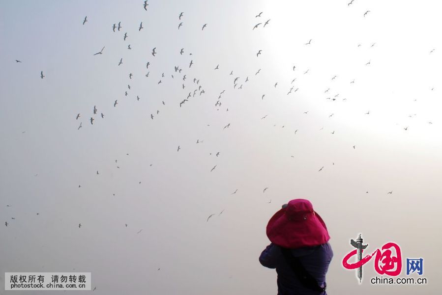 一名攝影愛(ài)好者在萬(wàn)鳥(niǎo)島上拍攝海鷗起舞的畫(huà)面