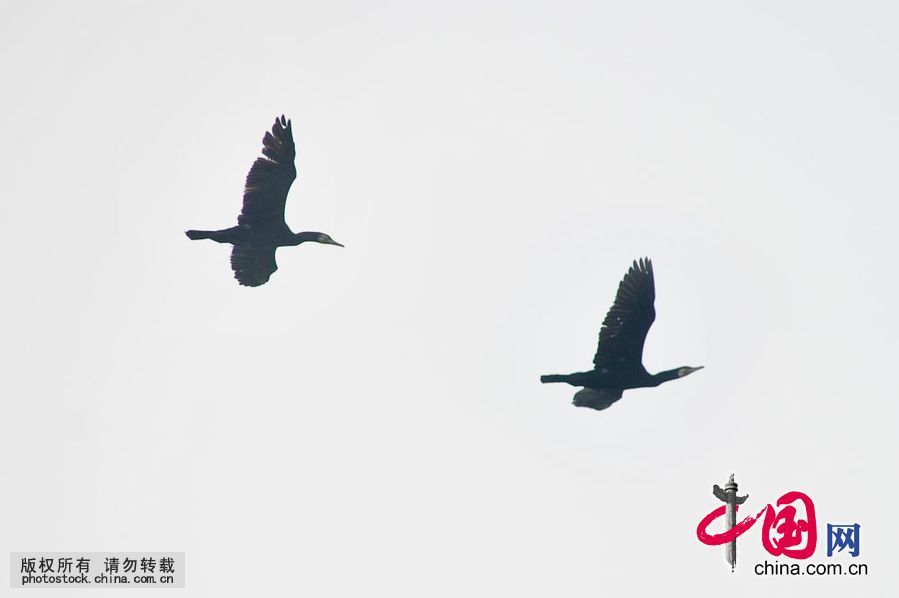 兩只鸕鶿在萬(wàn)鳥(niǎo)島上空盤(pán)旋的畫(huà)面