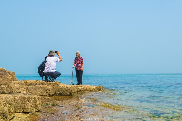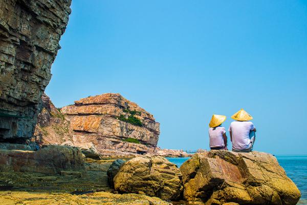 ↗ 一對(duì)母子在海邊的礁石上拍照。笑容綻放在老人那張布滿歲月痕跡的臉上,一雙滿是深褶的手拄著拐杖, 站得筆直。老人家已經(jīng)七十多了,卻是頭一回看到大海,兒子特意帶著老人從東北過來玩的。