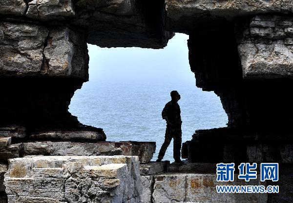一位游客在海蝕作用形成的“石樓”內(nèi)游覽