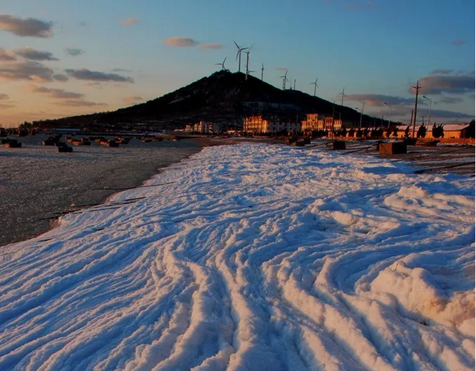 海灘上的雪,山東長島旅游美就美在彎彎曲曲的紋理。海浪撲打到沙灘上,被岸線作用成各種自然彎曲,凝固之后就形成了美麗的白色褶皺,仿佛一道道冰雪的年輪,記錄了海浪的執(zhí)著歷程。