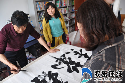 為了讓村民感受到高雅的文化氣息,社市委組織書法家趙海東、王寧波自帶筆墨紙氈為村民現(xiàn)場書寫和贈送書法作品。二人因陋就簡,山東長島漁家樂在不大的房間和平臺上,為村民精心書寫作品。群眾被一幅幅精美的作品所折服,叫好聲不絕于耳。不大的桌面被村民圍得里三層外三層。鋪紙、展紙、揮毫、潑墨,書法家的動作干凈利落,書法作品剛勁有力。