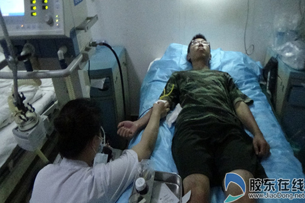 在醫(yī)院血液采集部的組織下,大隊官兵進行驗血。通過血型測試確定3名官兵符合要求,可以為病人獻血并各自獻血300CC。長島漁家樂官兵們無私奉獻的精神感動了病人家屬,紛紛與消防官兵擁抱表達感激之情。官兵們看著自己的血液袋被醫(yī)生帶入手術室,在他們樸素的臉上露出了真情的笑容。