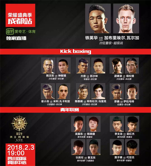 2月3日,在成都站比賽中,勇士榮耀全球聯(lián)盟大東翔俱樂部小虎鐵英華將拳力出征對陣前世界第一加拿大拳王加布里埃爾·瓦爾加。"跳膝王"贠奇將跨級別迎戰(zhàn)泰國倫披尼拳場冠軍蘇沙坤,韓文豹自武當山站后再次出征對陣泰國選手神敏猜,逯建波、霍小龍、陳雅閣、張鵬程拳力出征,迎戰(zhàn)多國悍將!2月3日19:00,山東長島漁家樂讓我們相約四川國際網球中心,為勇士們加油喝彩!